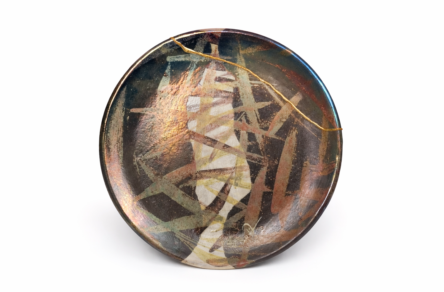 This ceramic plate sculpture by Khaled Sirag presents an abstract composition defined by layered lines, tonal contrasts, and expressive surface textures.