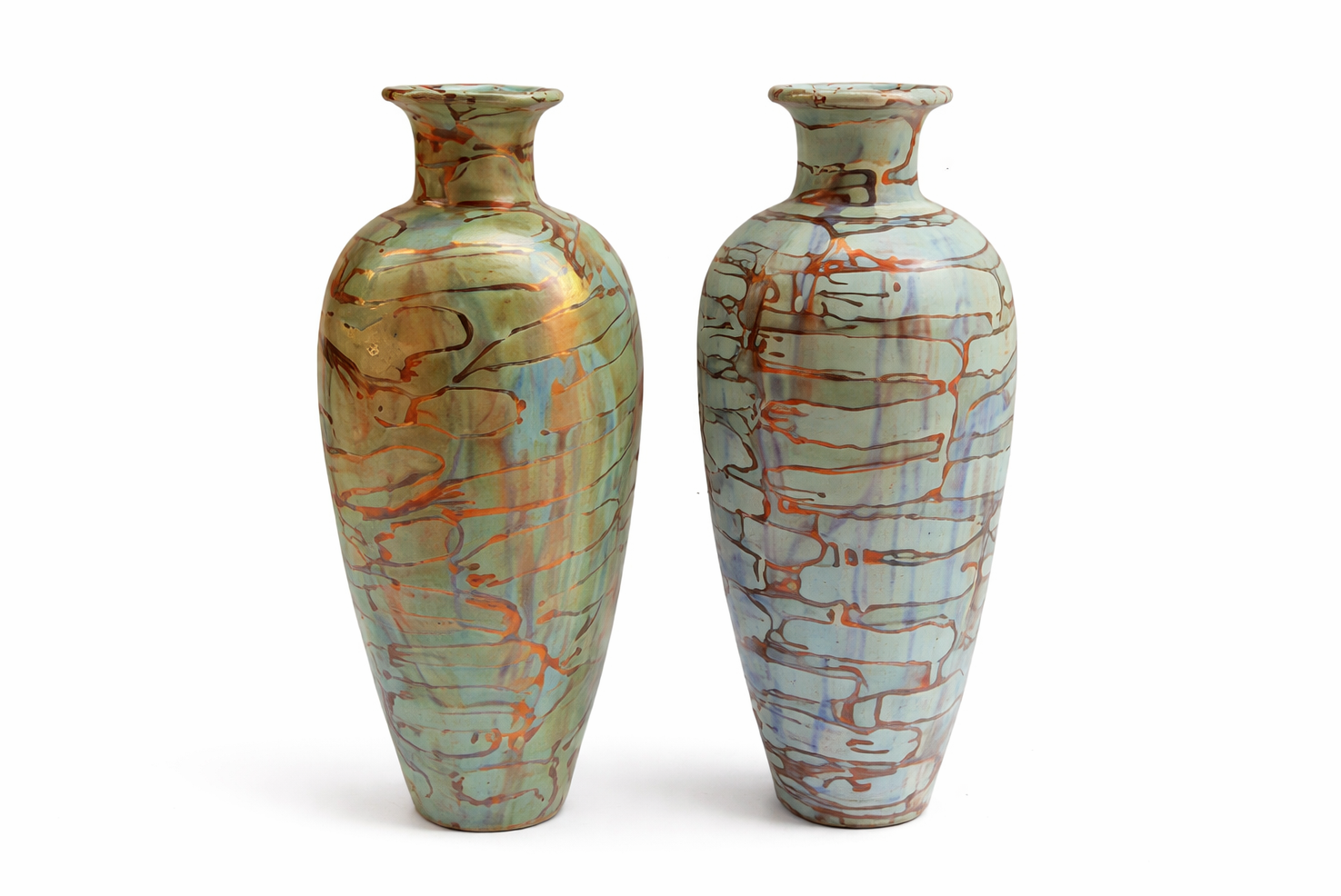 This contemporary ceramic sculpture by artist Khaled Sirag features a pair of elongated vessel forms, distinguished by expressive linear markings and a harmonious color palette.