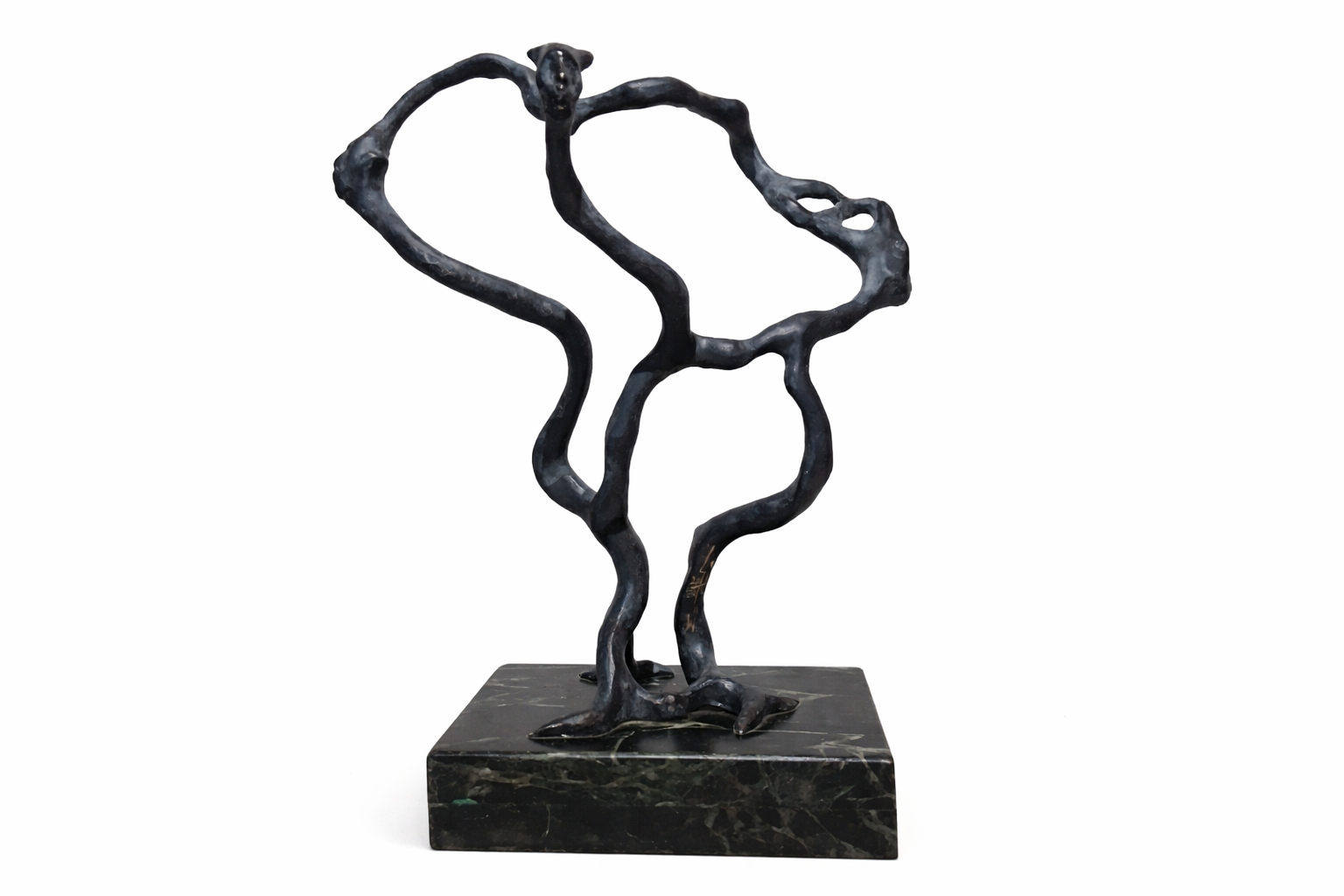 Crafted in bronze with a sculptural base, this artwork reflects both strength and vulnerability, inviting interpretation from every angle.