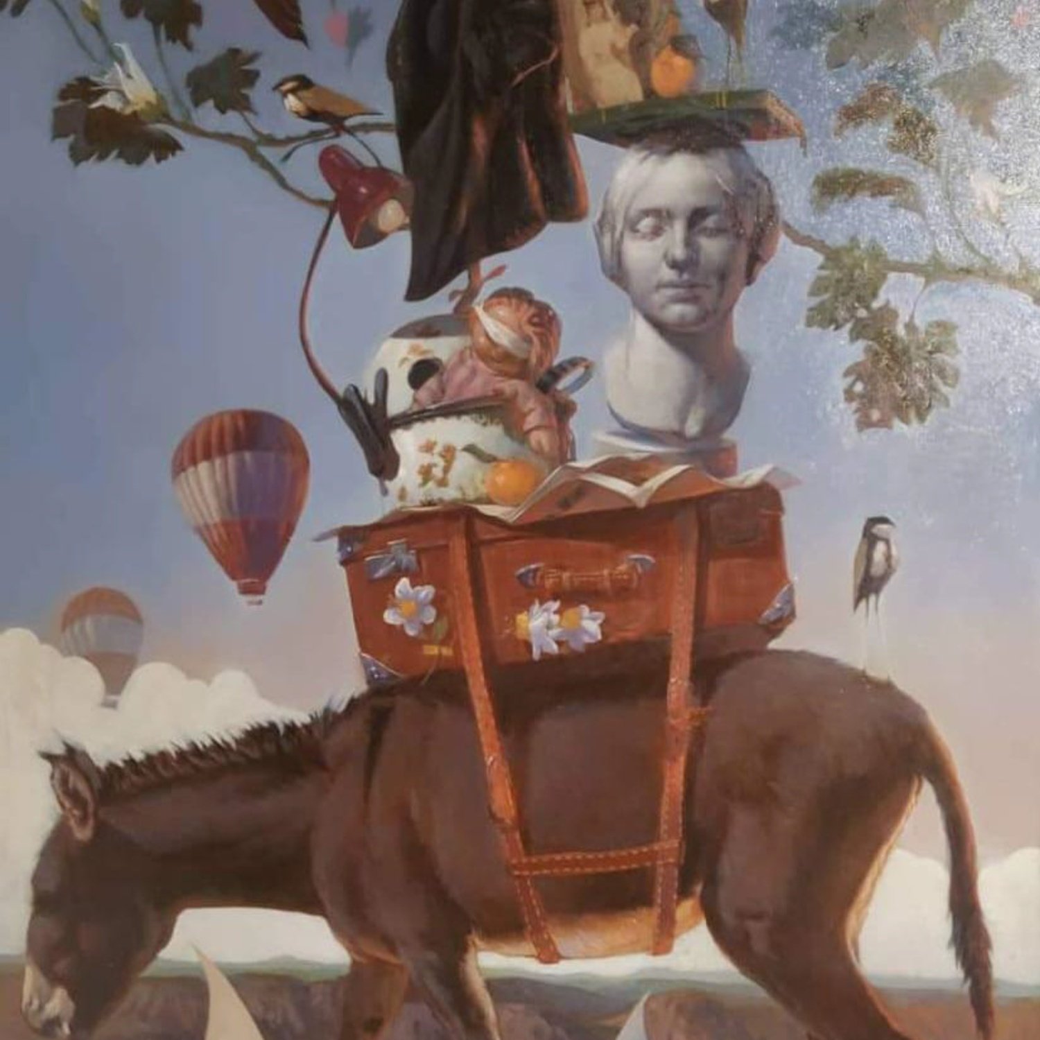 Painted in oil on canvas, the artwork blends realism with dreamlike symbolism. Floating birds, hot air balloons, and delicate natural elements surround the central figure, creating a whimsical atmosphere that blurs the line between reality and fantasy.