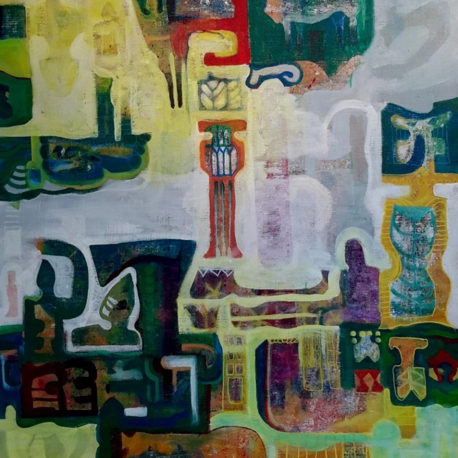 A vibrant abstract acrylic painting by Mohab Elghaffar (2025) combining symbolic forms and architectural elements into a contemporary visual landscape.
