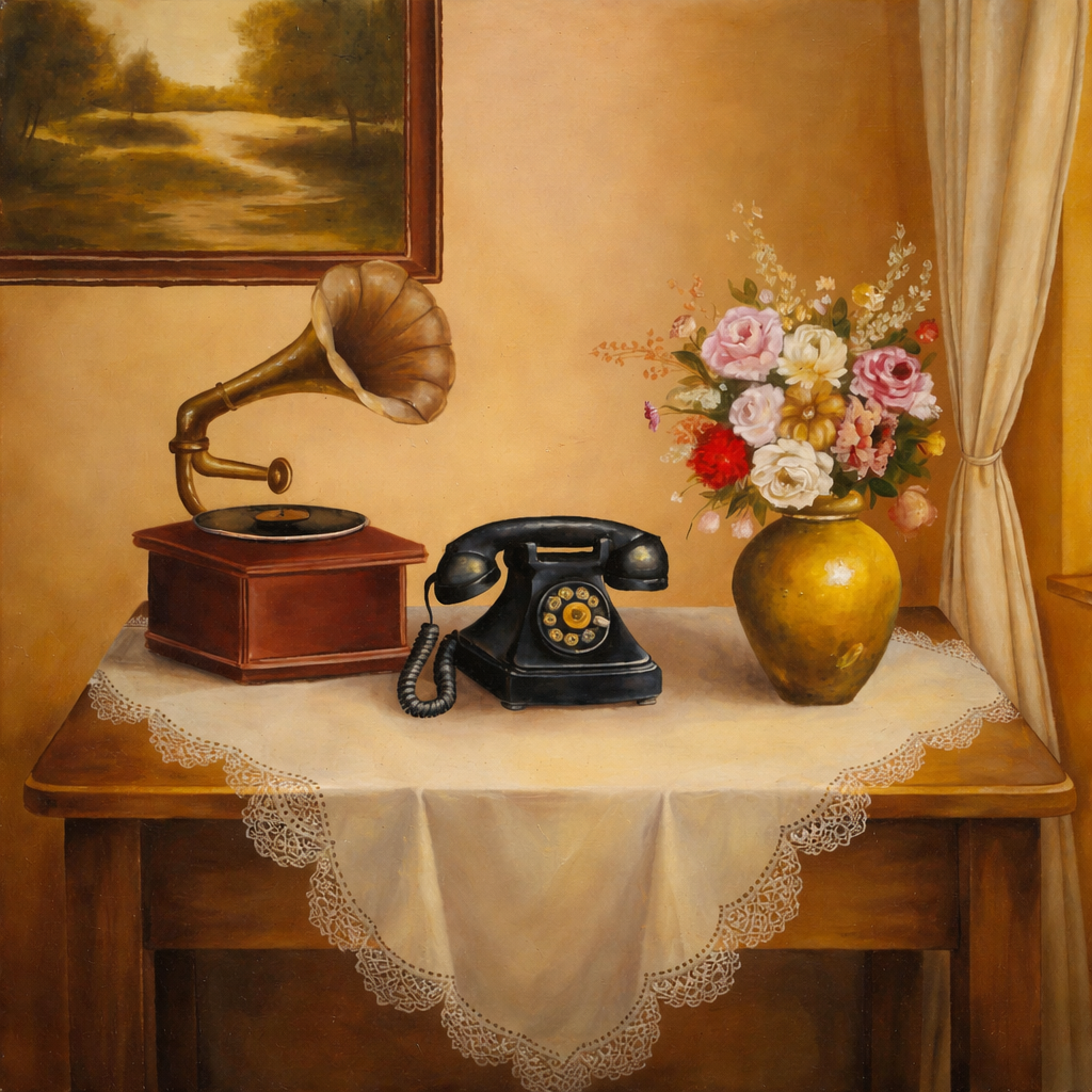 This artwork by Hend Mohamed presents a refined still-life composition that captures the warmth and nostalgia of a classic interior setting. The painting features a vintage gramophone, a traditional rotary telephone, and a delicate floral arrangement placed gracefully on a lace-covered table. The soft golden tones and balanced lighting create a sense of calm elegance and timeless sophistication.